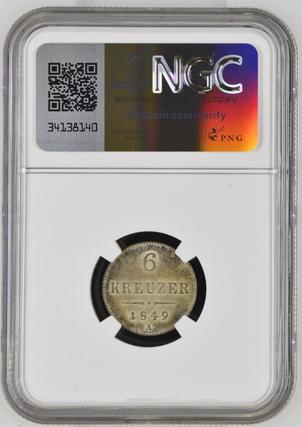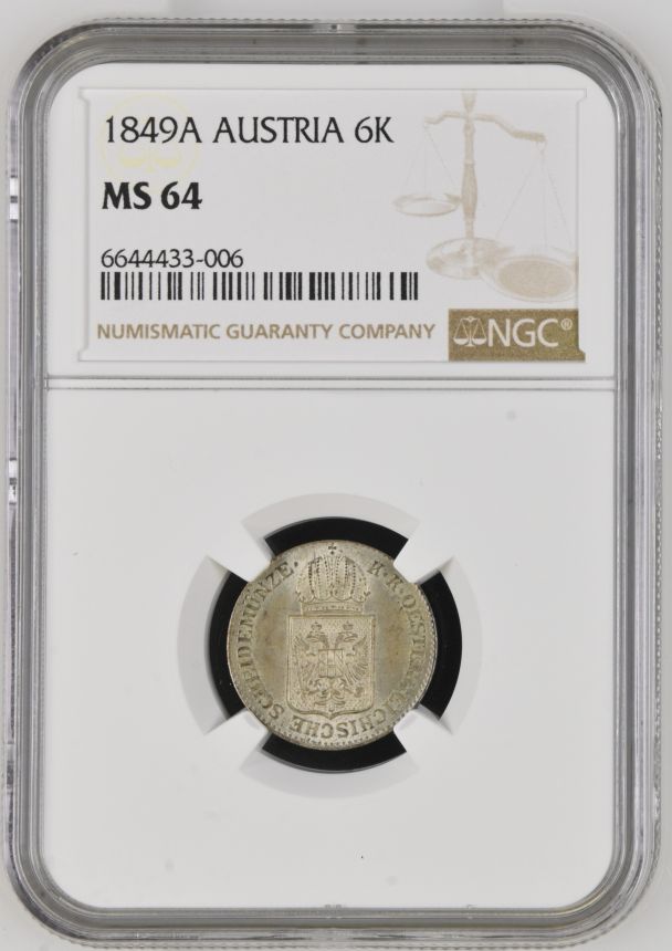 6 Krejcar 1849 A - František Josef I.Ag 0,438/1000, 19,5mm, 1,91g, hrana hladká, moc pěkný kus - NGC MS 64!!