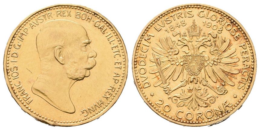 Jubilejní 20 Koruna 1908 k 60. letům vlády FJI - Au 900/1000, 21mm, 6,775g, hrana hladká s nápisem spojenými silami tedy VIRIBVS VNITIS