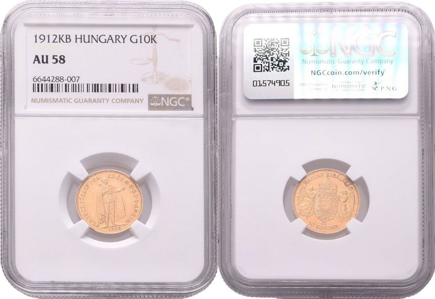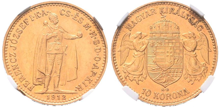 10 Koruna 1912 K.B. Kremnica NGC AU 58 Kremnica Uherská ražba - Au/Zlato 900/1000, 19mm, 3,387g