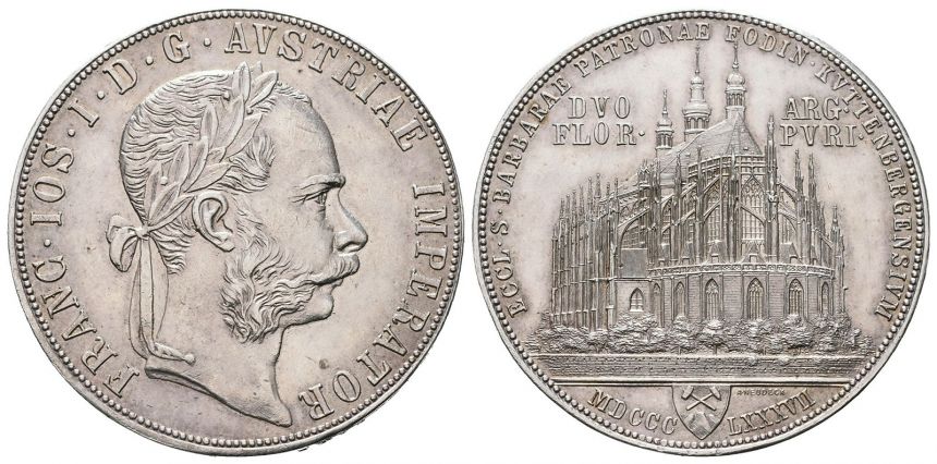 2 Zlatník 1887 - Obnovení dolování stříbra v Kutné Hoře, novoražba zn. GB na hraně. Velmi vzácná pozdější ražba!