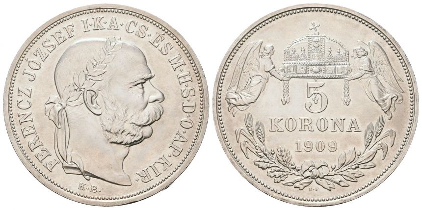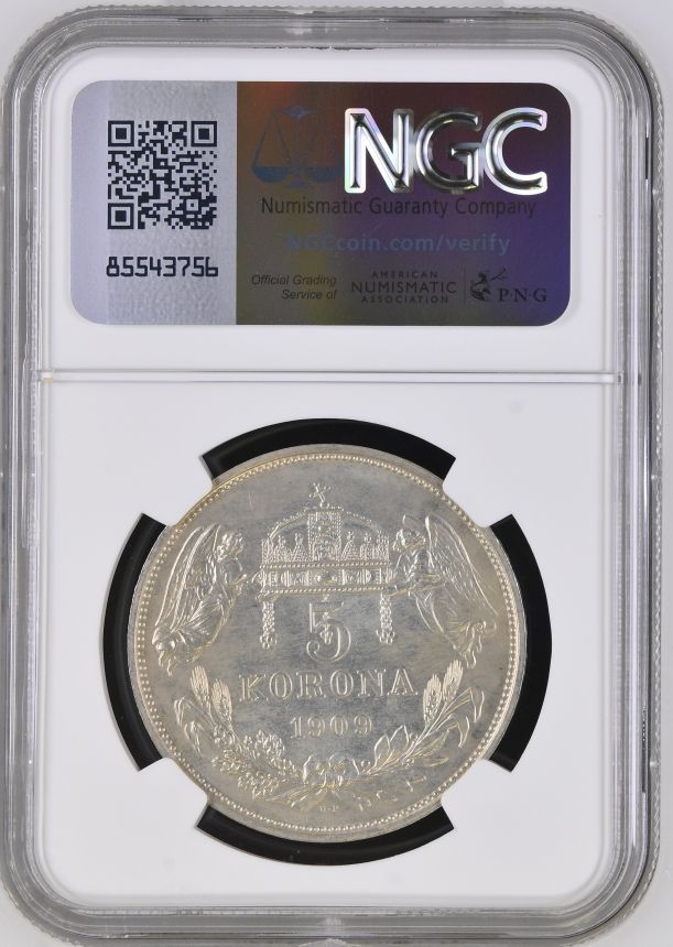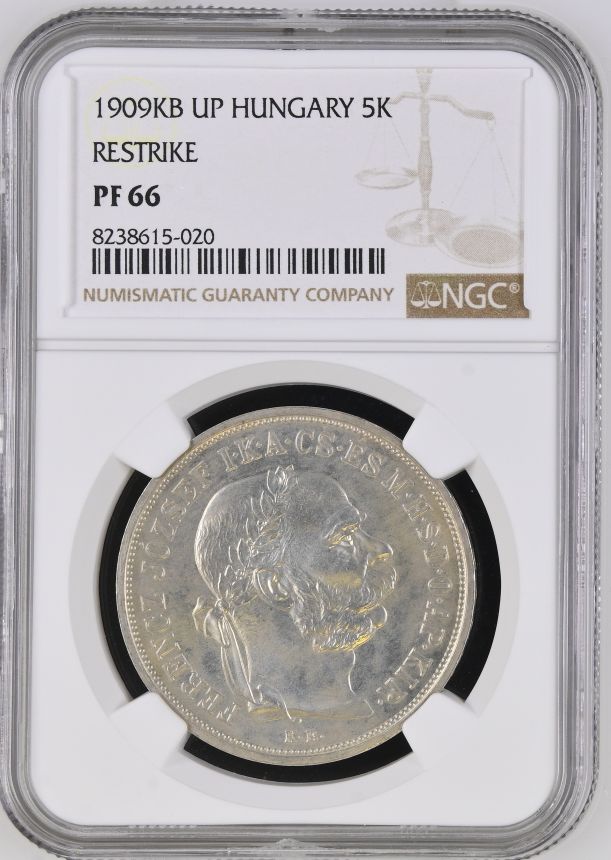 5 Koruna 1909/1967 KB, NGC PF66 - novoražba značená U. P. ražená firmou ARTEX v Budapešti v nákladu pouze 1000 ks
