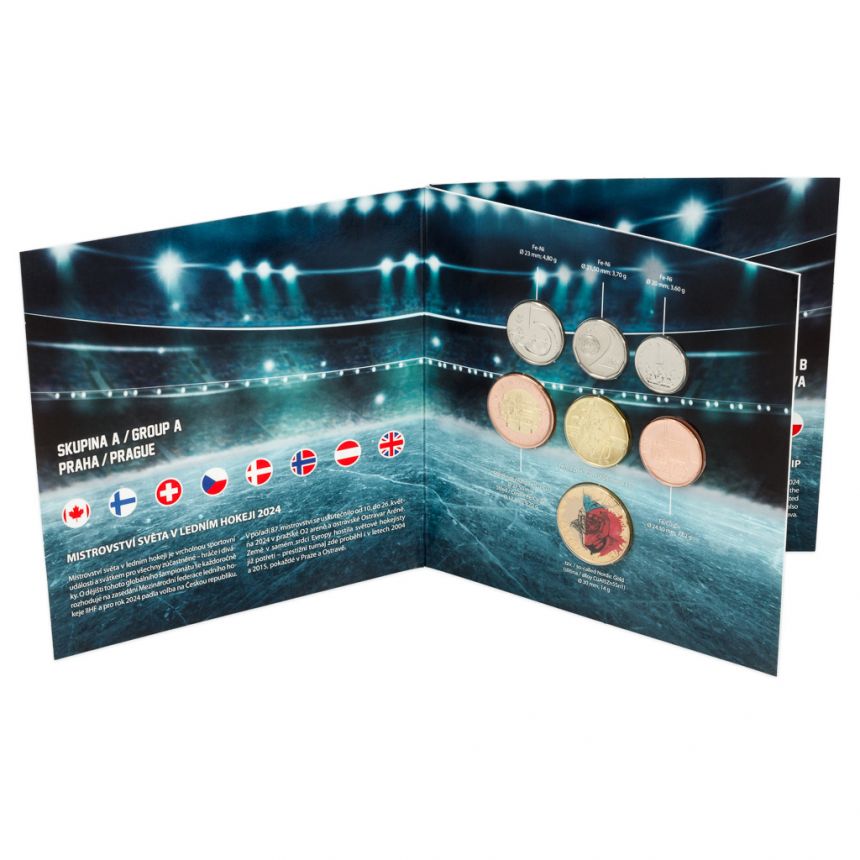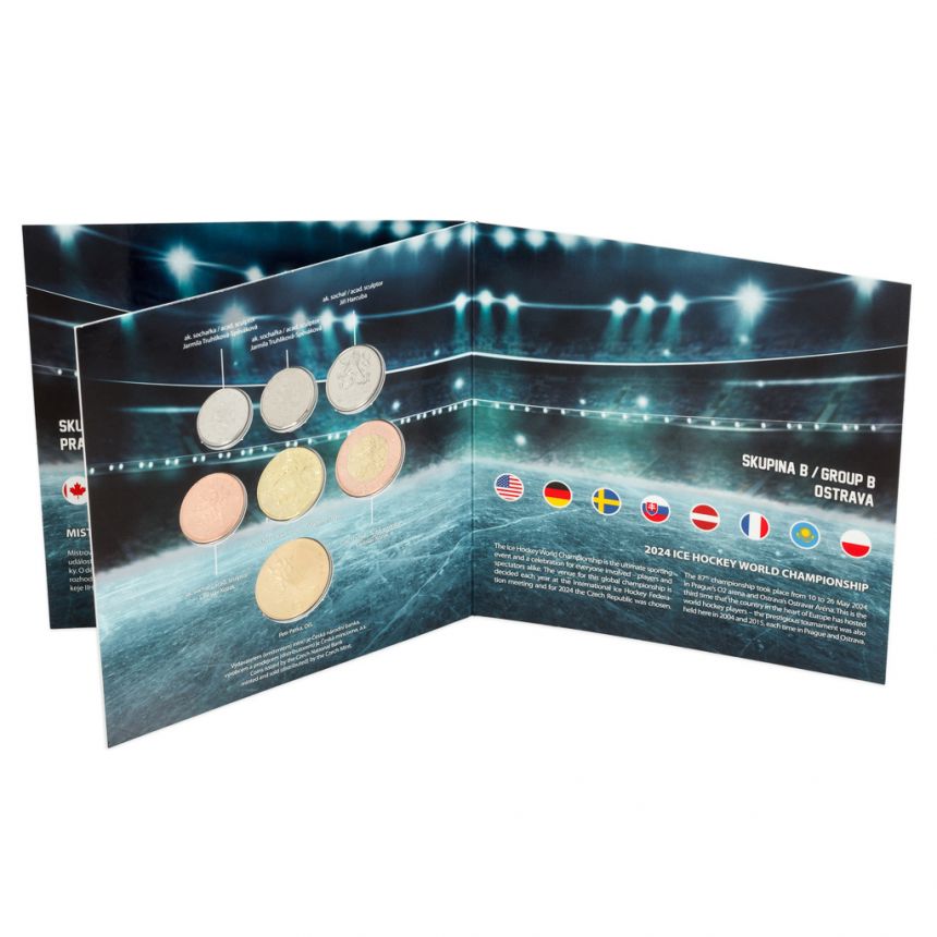 Tradiční sportovní sada oběžných mincí České mincovny a České národní banky je v roce 2024 věnována hokejovému mistrovství světa konanému v České republice.