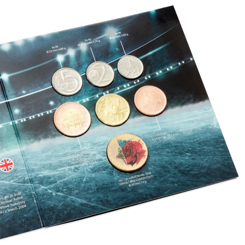 Ročníková sada oběžných mincí ČR v kvalitě stand Tradiční sportovní sada oběžných mincí České mincovny a České národní banky je v roce 2024 věnována hokejovému mistrovství světa konanému v České republice. Mistrovství světa v ledním hokeji je vrcholnou sportovní událostí a svátkem pro všechny zúčastněné – hráče i diváky. O dějišti tohoto globálního šampionátu se každoročně rozhoduje na zasedání Mezinárodní federace ledního hokeje IIHF a pro rok 2024 padla volba na Českou republiku. V pořadí 87. mistrovství se uskutečnilo od 10. do 26. května 2024 v pražské O2 areně a ostravské Ostravar Aréně. Země v samém srdci Evropy hostila světové hokejisty již potřetí – prestižní turnaj zde proběhl i v letech 2004 a 2015, pokaždé v Praze a Ostravě. V sadě najdete šest oběžných mincí s nominálními hodnotami 1, 2, 5, 10, 20 a 50 Kč, které byly vyraženy v roce 2024 a neprošly oběhem. Dalším dílem skládanky je speciální pamětní žeton medailéra Petra Patky, DiS., s hokejovými motivy a kolorováním v barvách české vlajky. To vše je uloženo do speciálního tematického balení.