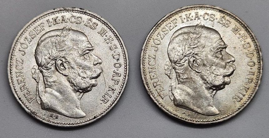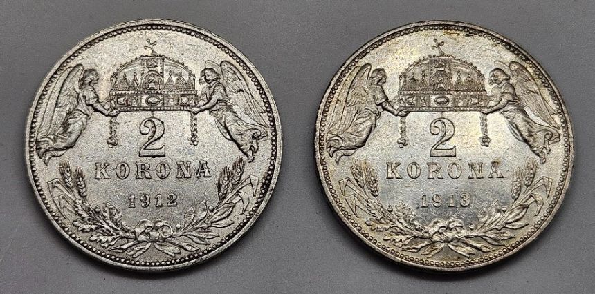 Sestava Uherská Andělíčková 2 Koruna 1912 a 1913 -)) Každá mince Ag 835/1000, 10g, 27mm, hrana s nápisem VIRIBVS VNITIS