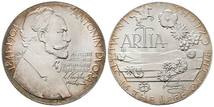 AR Medaile b.l. - Antonín Dvořák, emise pro Artii. Portrét, notový zápis, opis / Pohled do krajiny, nápis, opis. Punc. Ag 0,900, 38 mm (21,85 g), luxusní zachovalost, duhová patina, ražební lesk