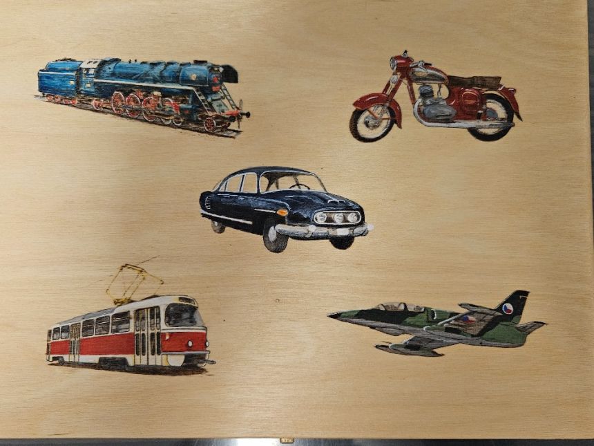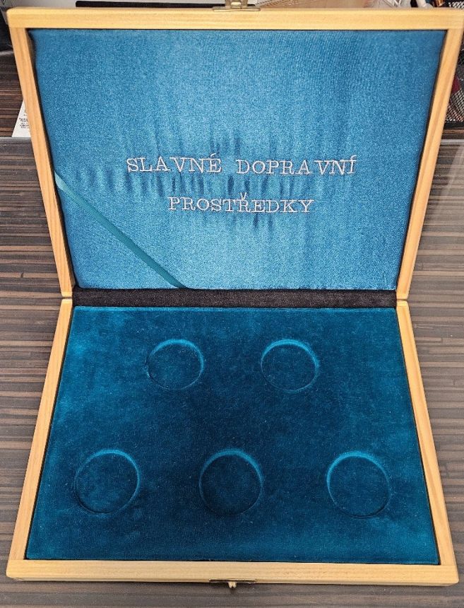 Krásná ETUE na 500 Kč od ČNB - Slavné dopravní prostředky - Unikátní! Materiál dřevo, rozměry 28,5x21cm.
