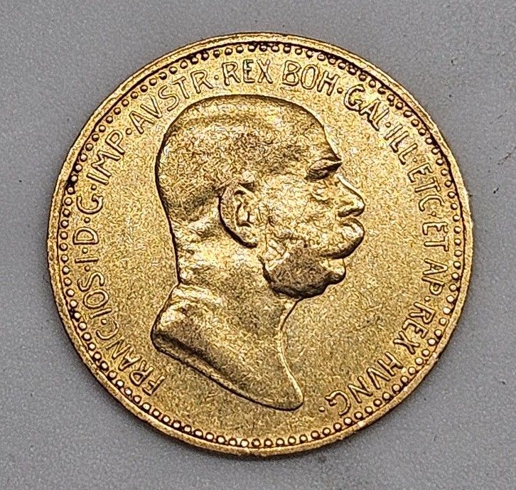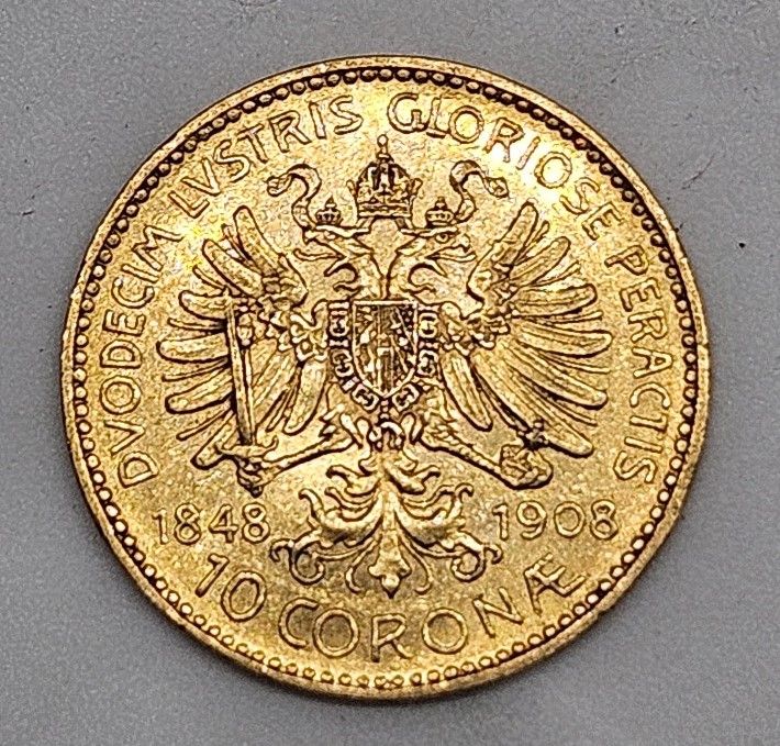 10 Koruna 1908 Jubilejní k 60 let vlády Františka Josefa I. - Au/Zlato 900/1000, 19mm, 3,387g (10)