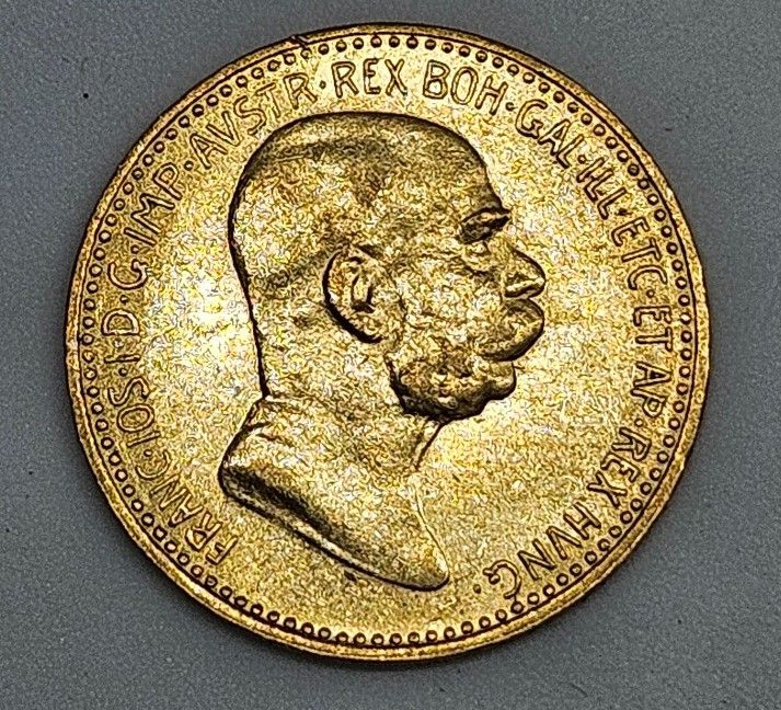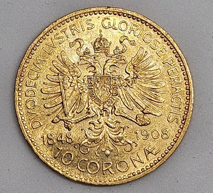 10 Koruna 1908 Jubilejní k 60 let vlády Františka Josefa I. - Au/Zlato 900/1000, 19mm, 3,387g (15)