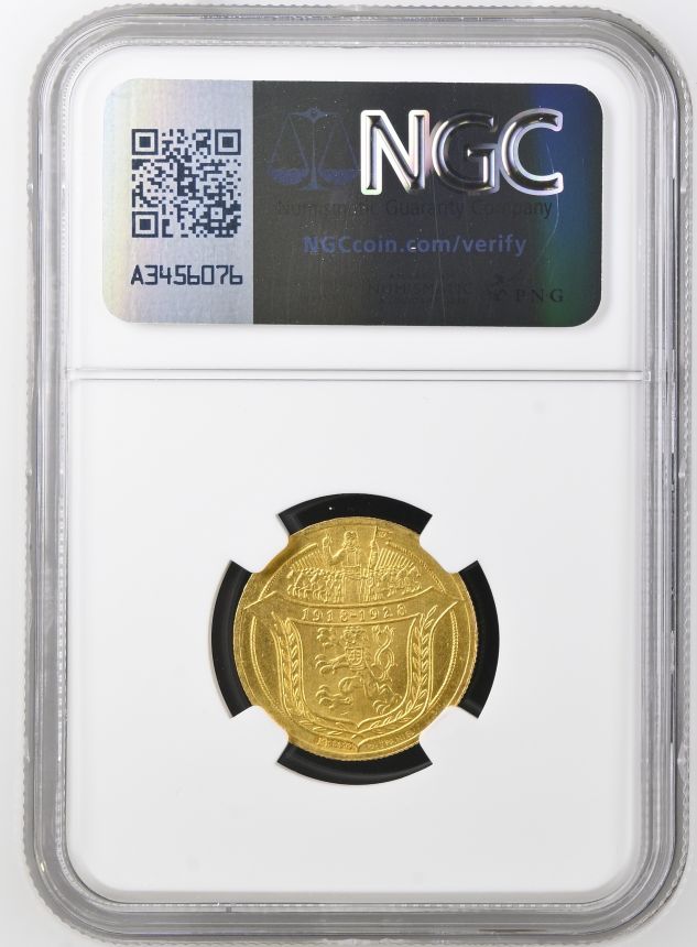 Dvoudukátová Au medaile Jsem ražen s Českého kovu - NGC MS63 - 1928 (O. Španiel) - 10. výročí vzniku republiky. Český lev ve štítě, nad ním kníže Václav v čele Blanických rytířů / Sv. Prokop orá s čertem. Au 22 mm (6,89 g)