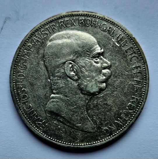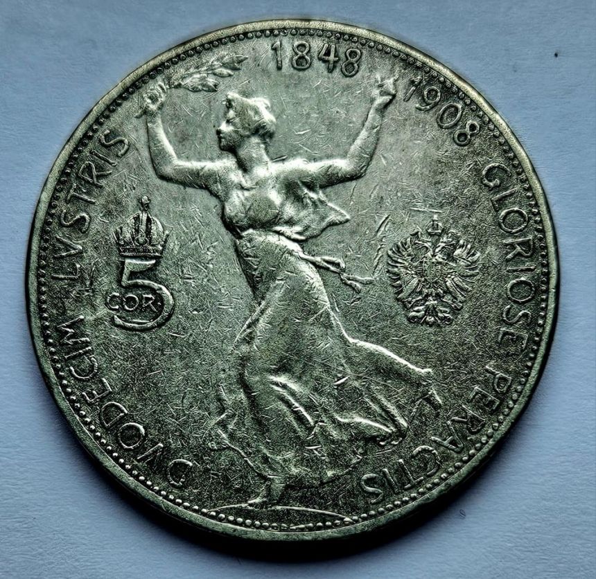 5 Koruna 1908 Jubilejní k 60 letům vlády FJI Ag 900/1000, 36mm, 24g, hrana hladká s nápisem VRIBVS VNITIS (spojenými silami)
