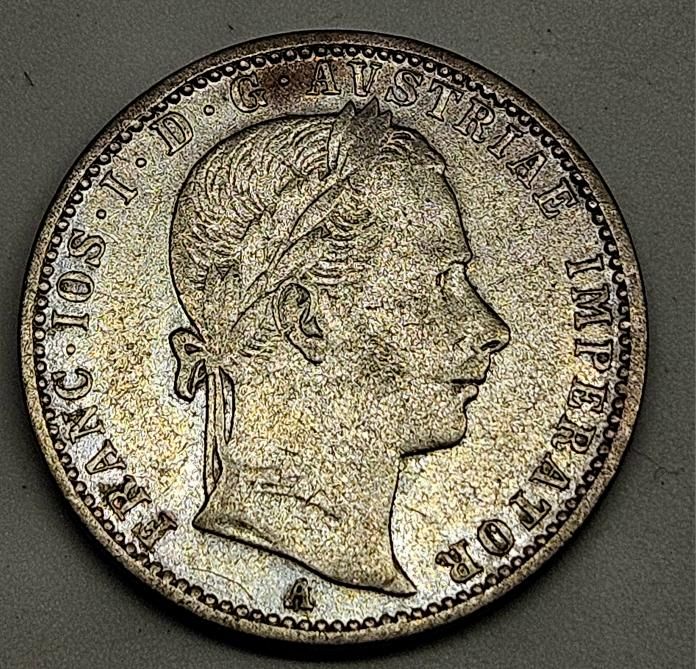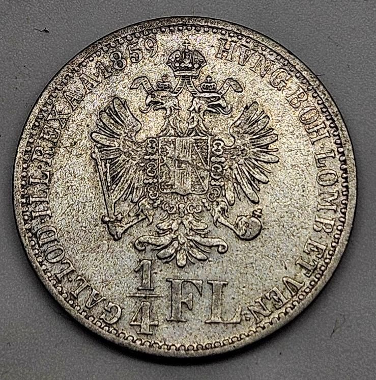 František Josef I. - 1/4 zlatník 1859 A - Ag 520/1000, 23mm, 5,342g hrana s nápisem VRIBVS VNITIS