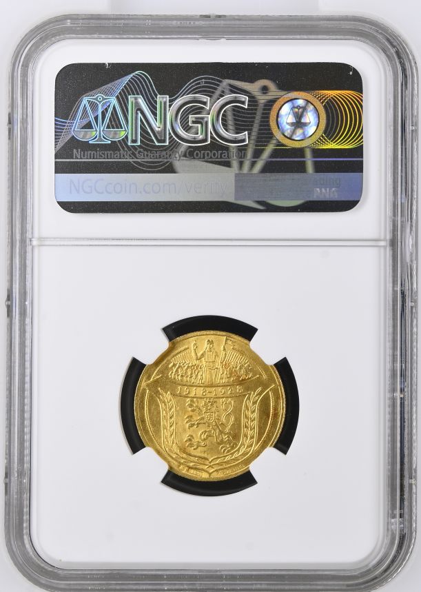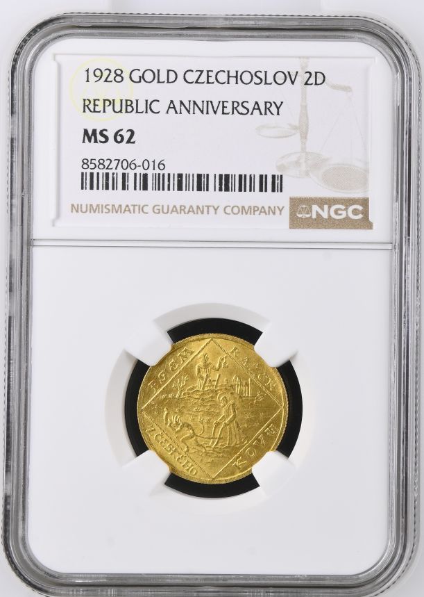 Dvoudukátová Au medaile Jsem ražen s Českého kovu - NGC MS62 - 1928 (O. Španiel) - 10. výročí vzniku republiky. Český lev ve štítě, nad ním kníže Václav v čele Blanických rytířů / Sv. Prokop orá s čertem. Au 22 mm (6,89 g)