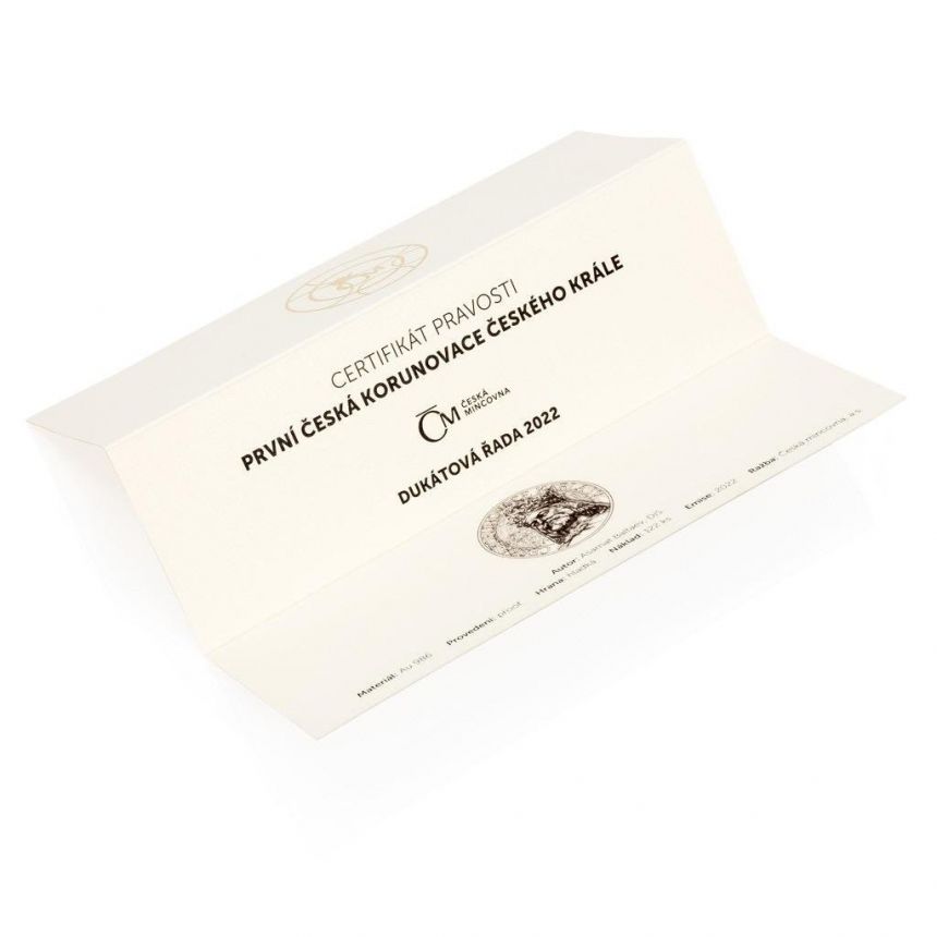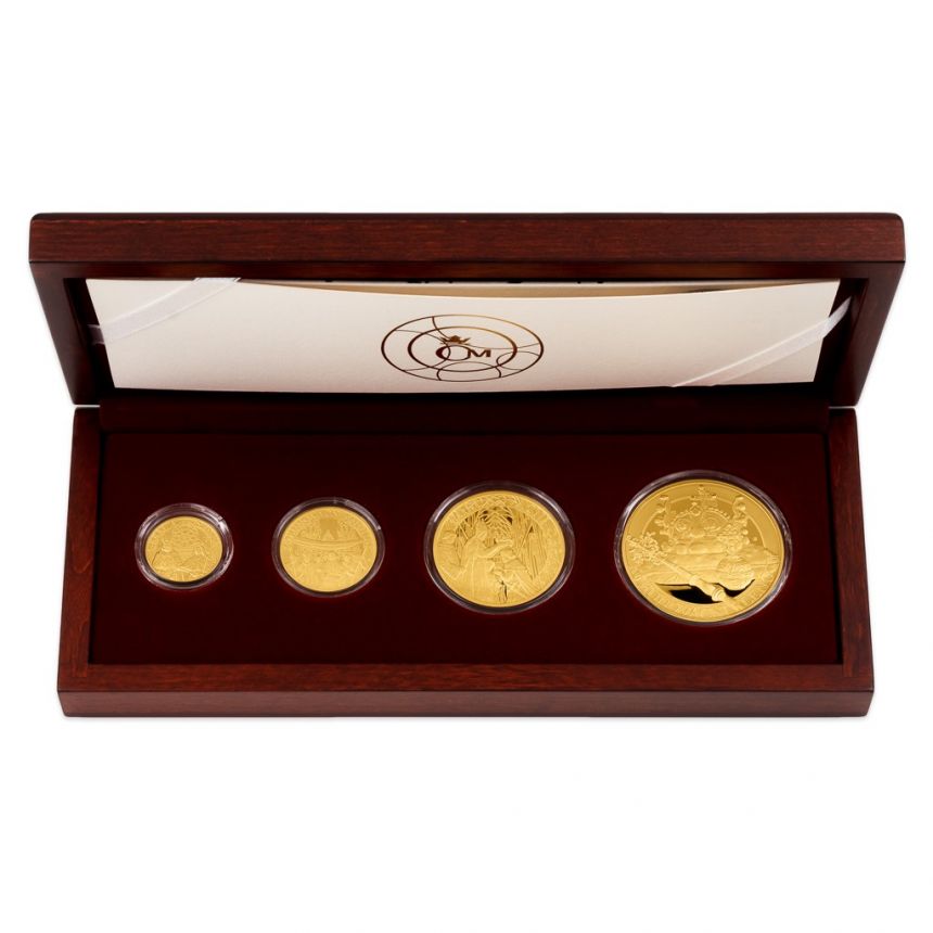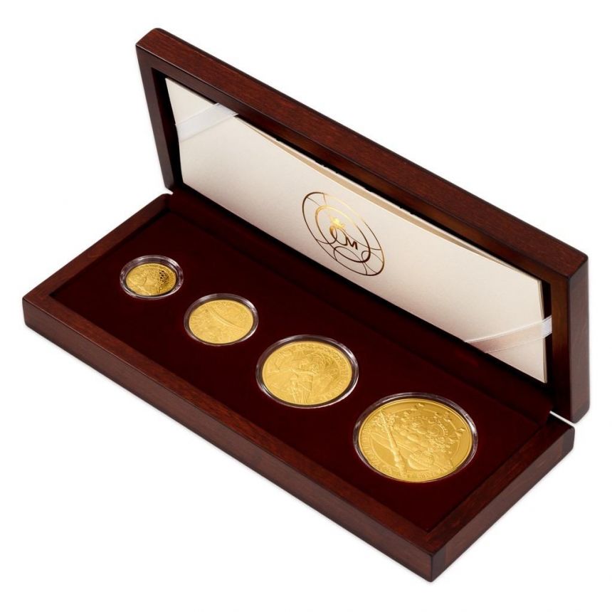 Čtveřice zlatých ražeb je uložena do luxusní dřevěné etue doplněné speciálním certifikátem pravosti, který přibližuje průběh památné korunovace.