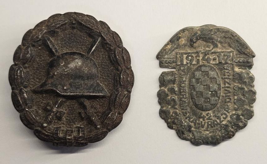1. Světová válka - odznak za zranění + odznak 42. domobranecké pěší divize, známé také jako Ďábelská divize, z let 1914–1917.