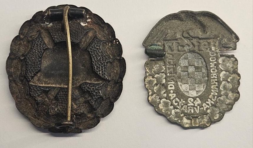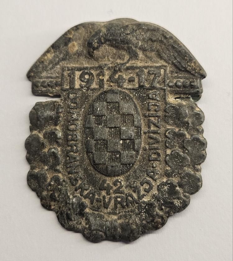 1. Světová válka - odznak za zranění + odznak 42. domobranecké pěší divize, známé také jako Ďábelská divize, z let 1914–1917. - vzácný odznak.