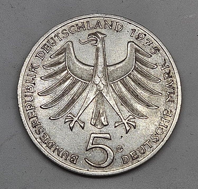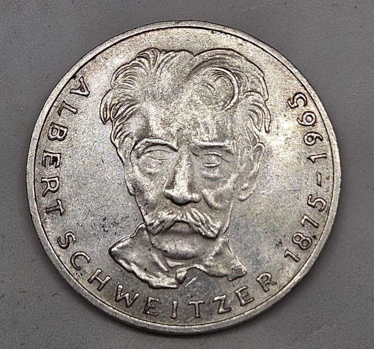 Německo 5 marek, 1975 100. výročí narození Alberta Schweitzera - Ag 625/1000, 11,2g, 29mm