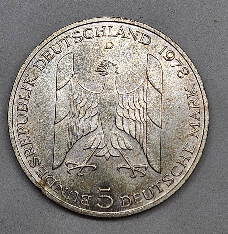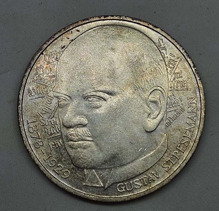Německo 5 marek, 1978 - 100. výročí - Narození Gustava Stresemanna - Ag 625/1000, 11,2g, 29mm