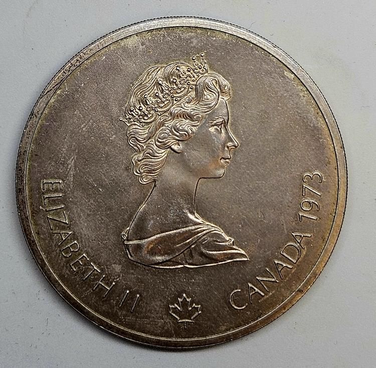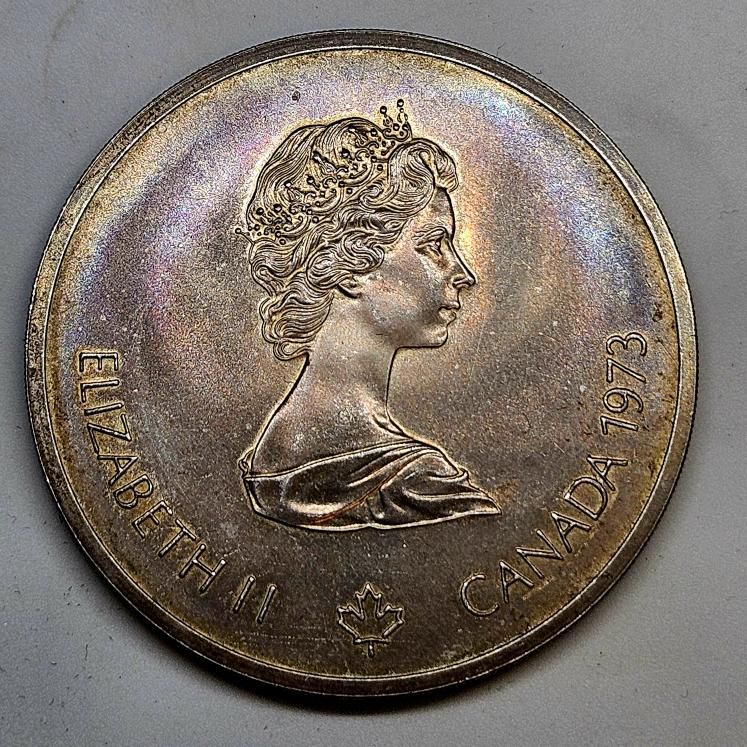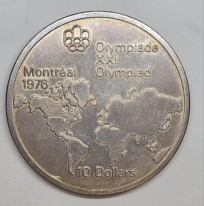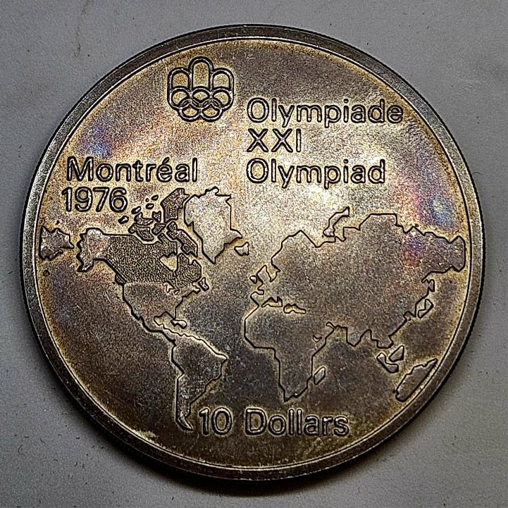 Kanada - 10 dolarů 1973 - Mapa světa. Alžběta II (1952-2022). 1976 Olympijské hry Montreal. Stříbro ryzosti 925/1000, 48,6 g - krásná duhová patina