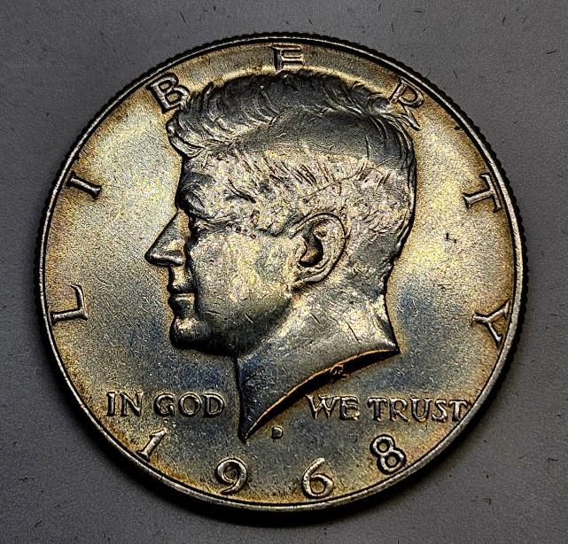 Spojené státy americké ½ dolaru, 1968 Kennedyho půldolar - Stříbro 0.900 Hmotnost (g) 12,5 Průměr (mm) 30,6