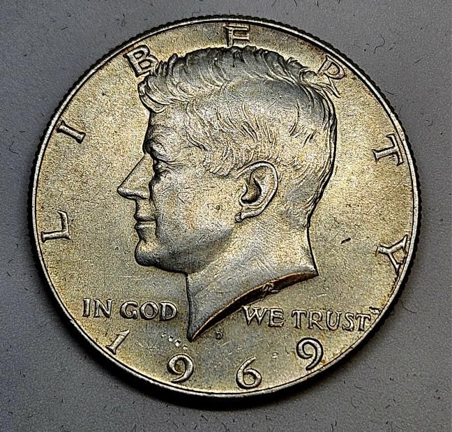 Spojené státy americké ½ dolaru, 1969 Kennedyho půldolar - Stříbro 0.900 Hmotnost (g) 12,5 Průměr (mm) 30,6