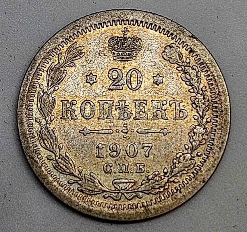 Ruská říše 20 kopějek, 1907 - Stříbro 0.500 Hmotnost (g) 3,6 Průměr (mm) 22