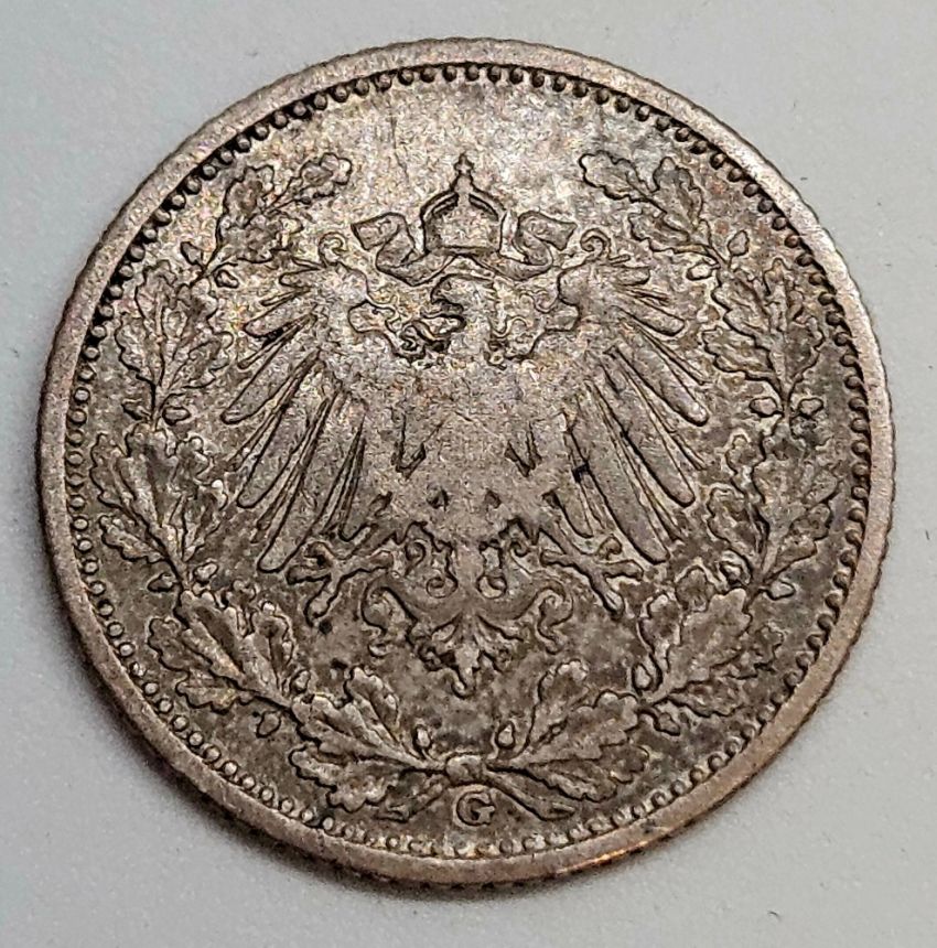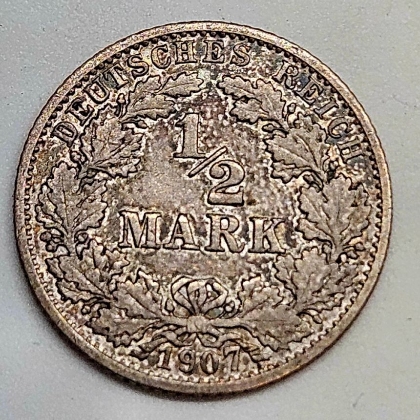 Německo ½ marka 1907 G - Stříbro 0.900 Hmotnost (g) 2,77 Průměr (mm) 20