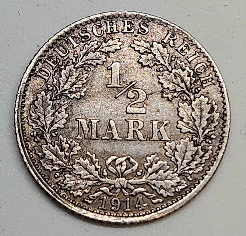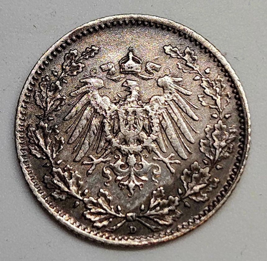 Německo ½ marka 1914 D - Stříbro 0.900 Hmotnost (g) 2,77 Průměr (mm) 20