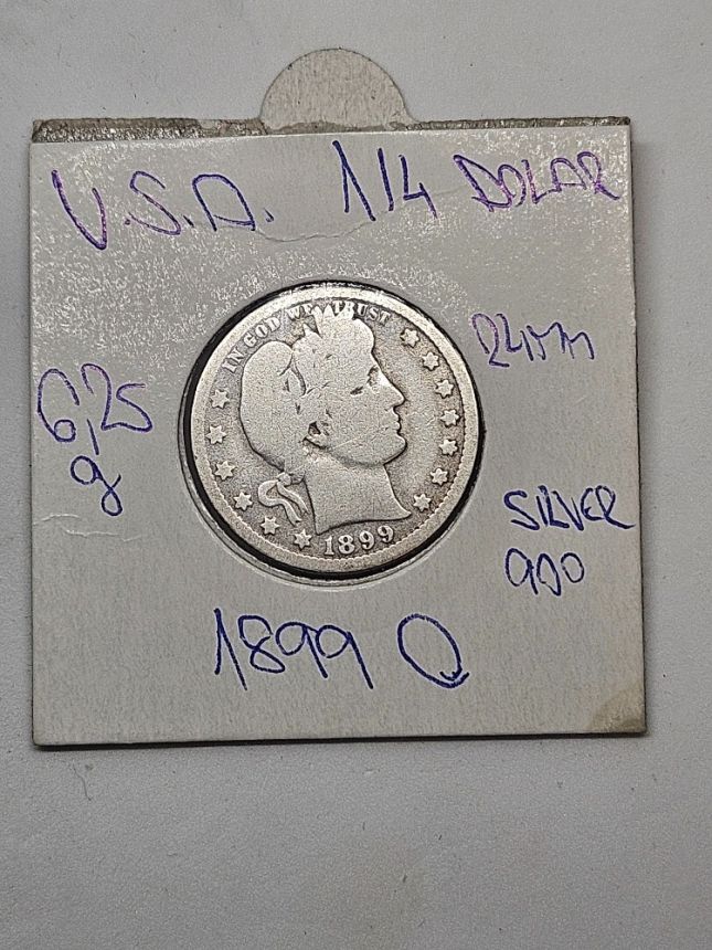 Spojené státy americké ¼ dolaru, 1899 Barber Čtvrťák - Stříbro 0.900 Hmotnost (g) 6,25 Průměr (mm) 24,26