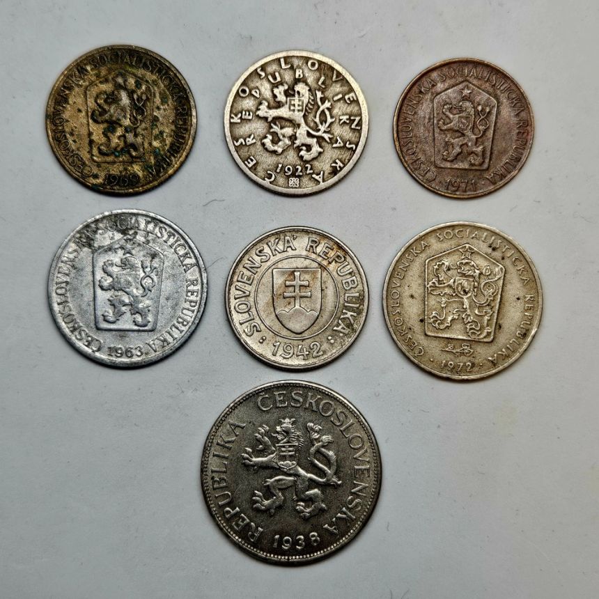 Obsahuje: 1 Kčs 1989, 1Kčs 1922, 50 haléř 1971, 25 haléř 1963, 1 korunu Slovenskou 1942, 2 Kčs 1972, 5 Kč 1938
