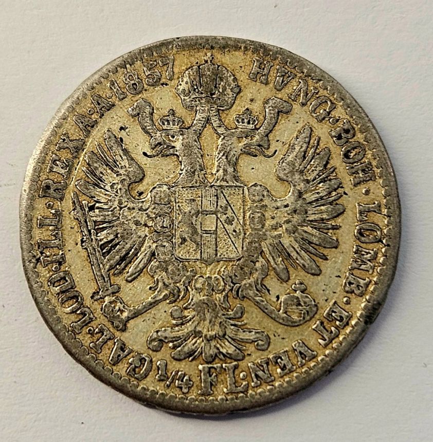 František Josef I. - 1/4 zlatník 1857 V - Ag 520/1000, 23mm, 5,342g hrana s nápisem VRIBVS VNITIS - RR!