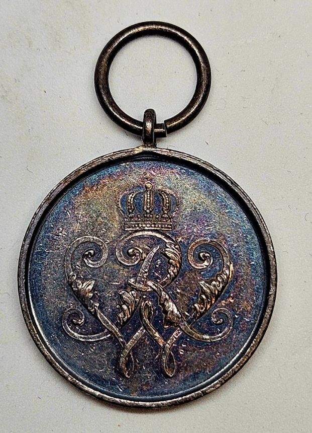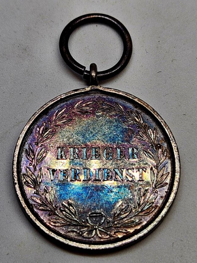 Stříbrná Pruská medaile - Krieger Verdienst - krásná duhová patina