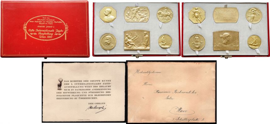 Sada 6 pozlacených AE medailí 1. mezinárodní myslivecká výstava ve Vídni, původní kožená etue, 1910, Wien. A. Hofmann, H. Schäfer, W. Hejda RR!