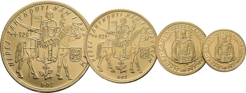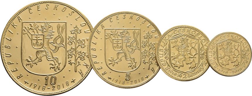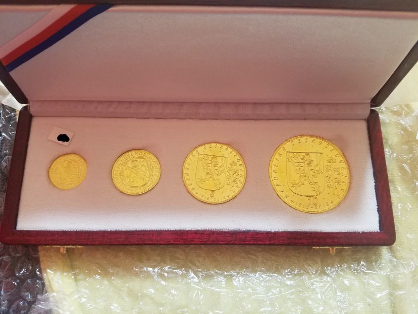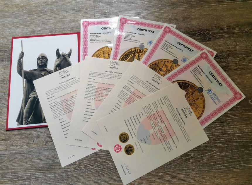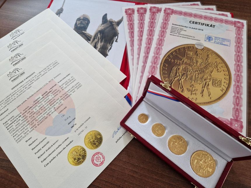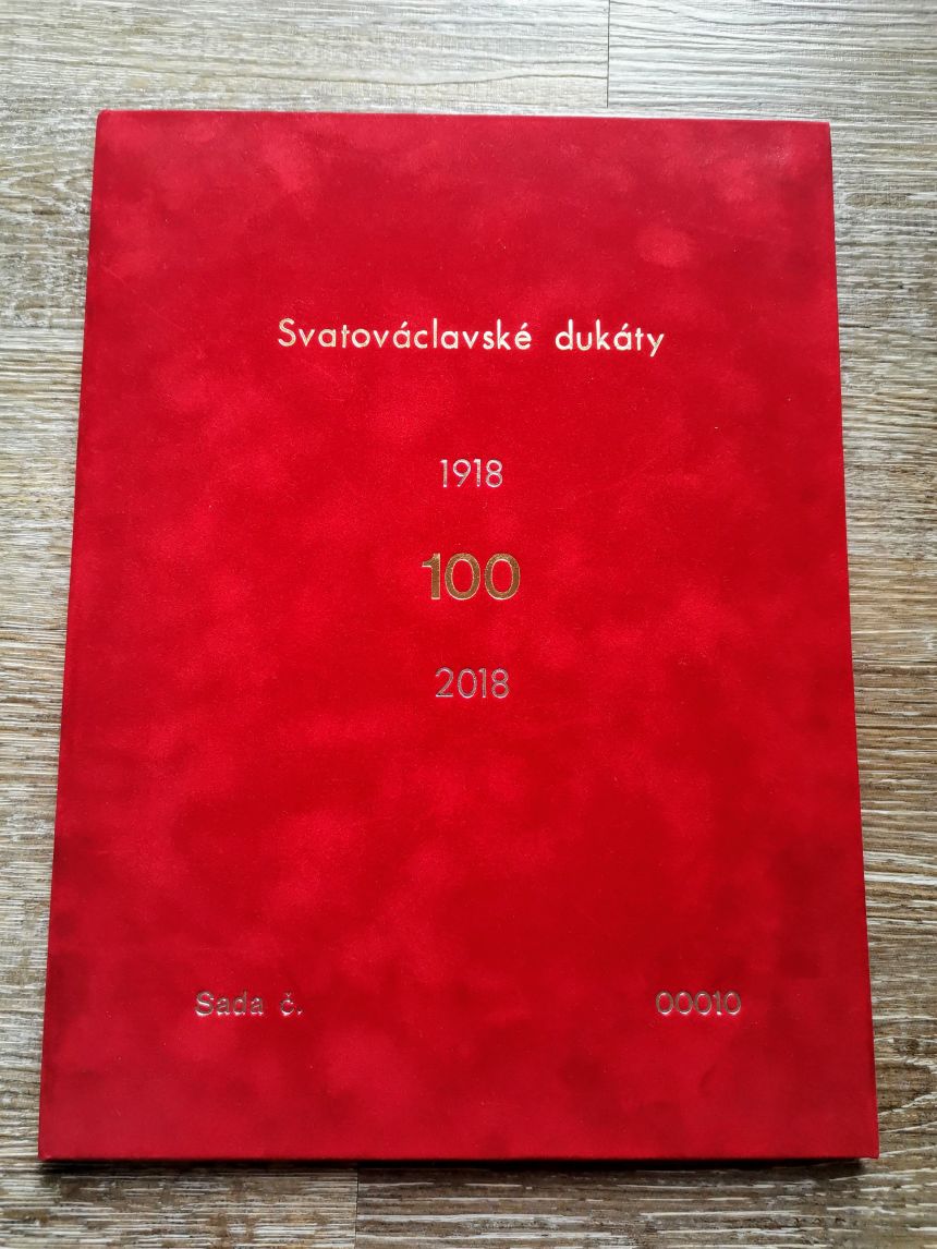Sada mincí Svatováclavské dukáty 1918 - 2018 (10, 5, 2 a 1 Dukát), číslo 10 (sestaveno pouze 100 sad), společná dřevěná etue, certifikáty Mincovna Kremnica, tisk STC Praha, opatřeny hologramy Puncovního úřadu, potvrzení puncovního úřadu sametové desky_4 ks