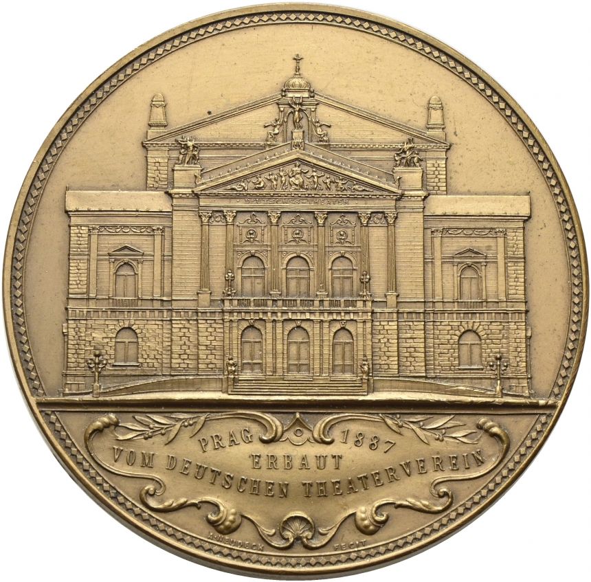 Jednostranná medaile AE 1887. A. Neudeck. Divadlo v Praze postavené Německou divadelní asociací. Av.: Pohled na budovu, v sekci v kartuši 3 řádky psaní: PRAG - 1887 / ERBAUT / VOM DEUTSCHEN THEATERVERIEN, signováno níže A. NEUDECK - FECIT. Průměr: 50 mm. Hmotnost: 46,19 g. Hauser: viz 2414