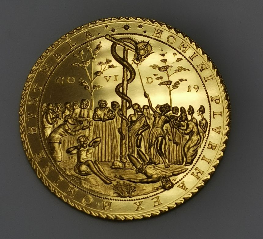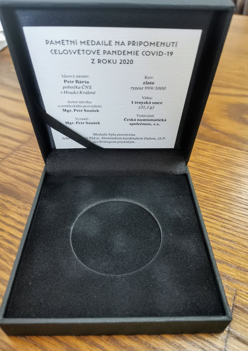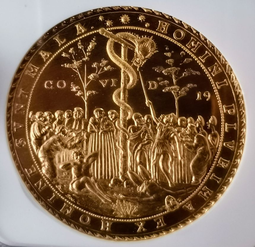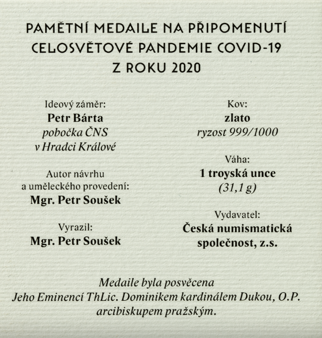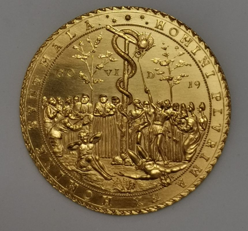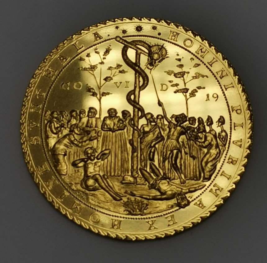 Medaile je upomínkou na pandemii koronaviru, která postihla svět v roce 2020. Medaile napodobuje středověký ochranný amulet, který chránil své majitele proti nákaze.