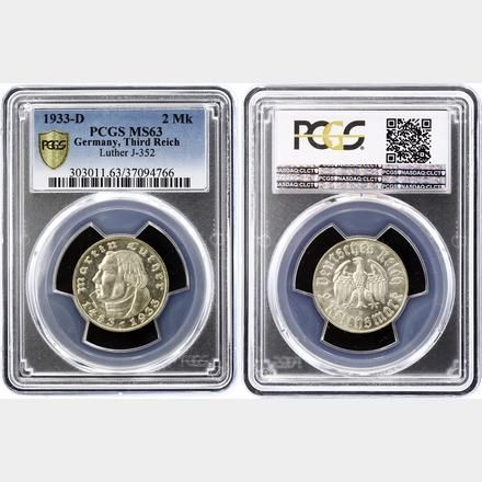 2 Marka 1933 - D - Třetí Říše Martin Luther PCGS MS 63