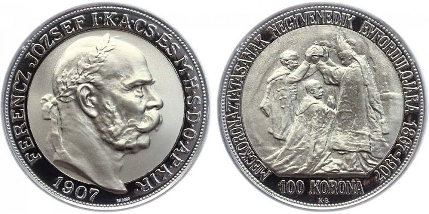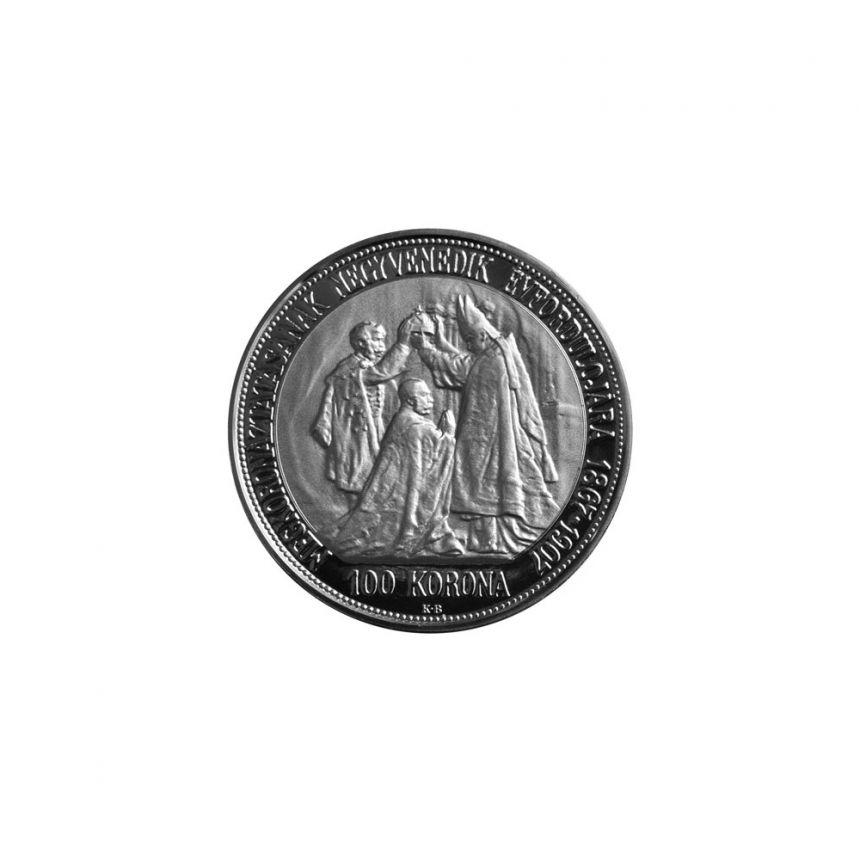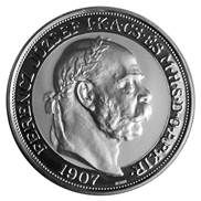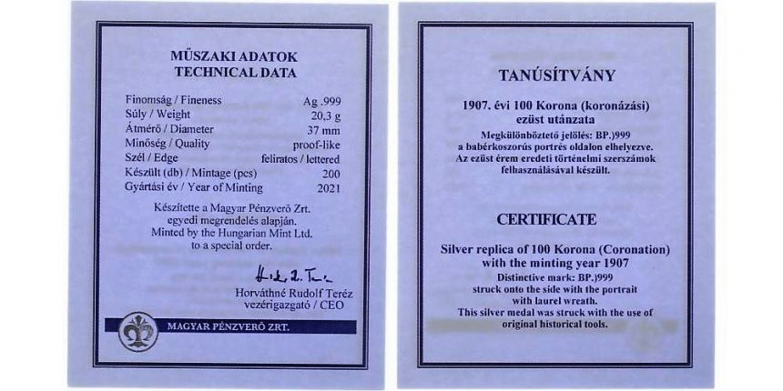 Ag korunovační 100 KORUNA císaře Františka Josefa I. realizována v roce 2021. Ražba realizována s použitím historických originálních razidel z roku 1907.