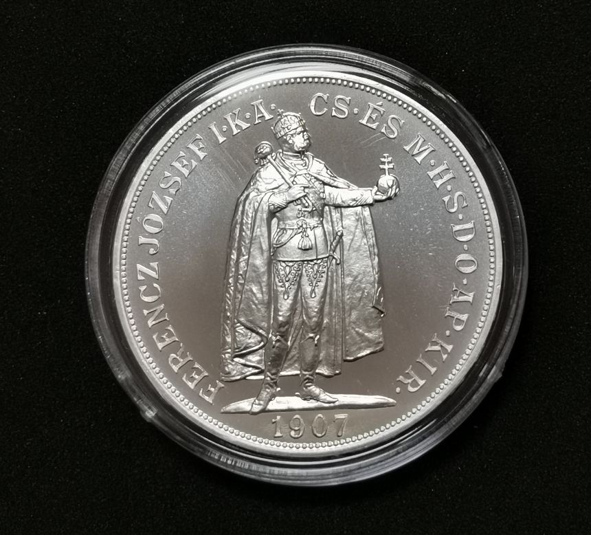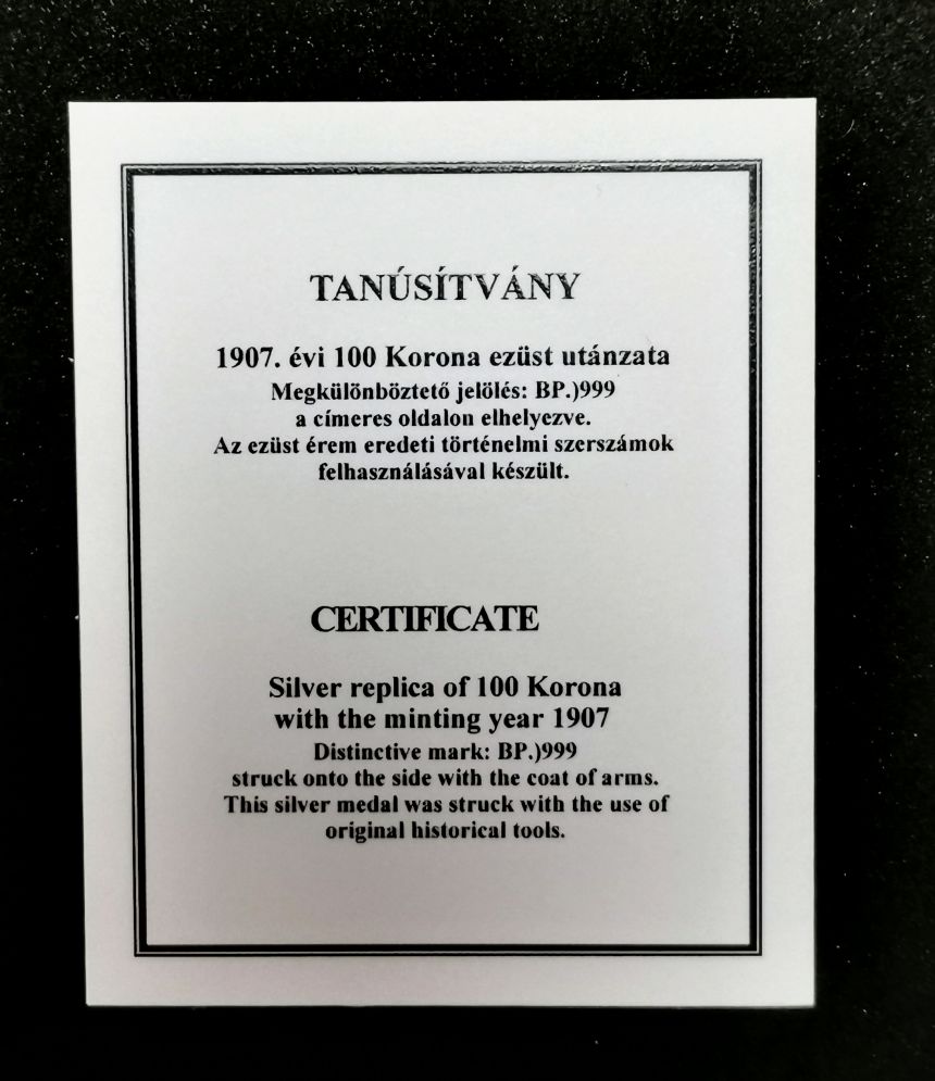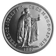 Ag 100 KORUNA 1907 K.B. - stojící panovník císaře Františka Josefa I. realizována v roce 2021. Ražba realizována s použitím historických originálních razidel z roku 1907.