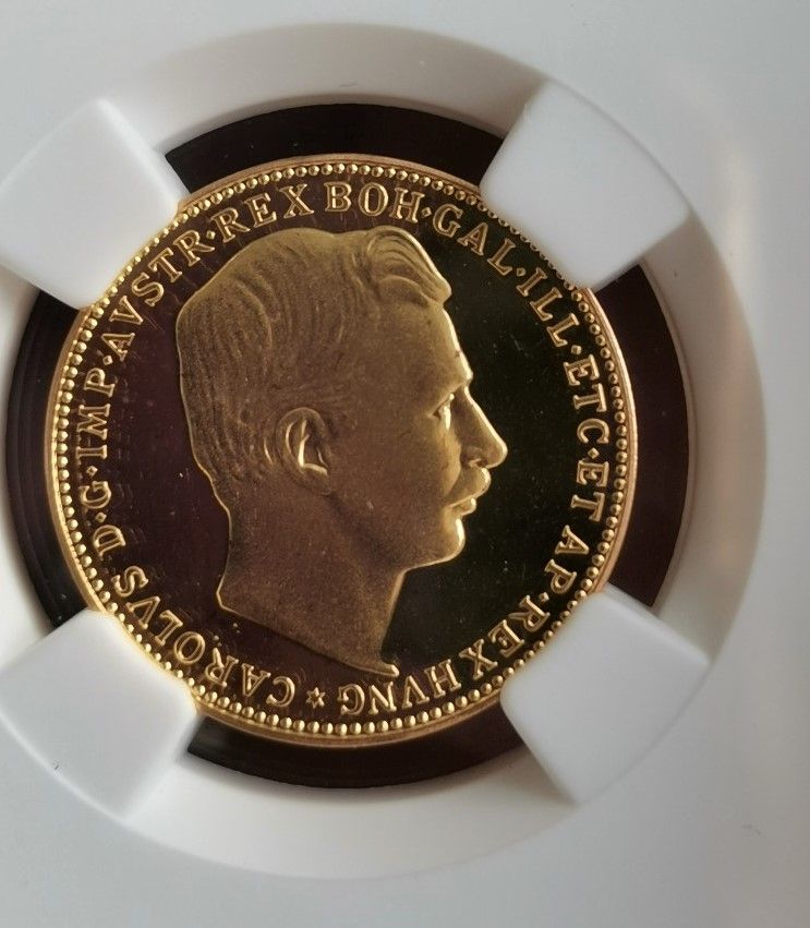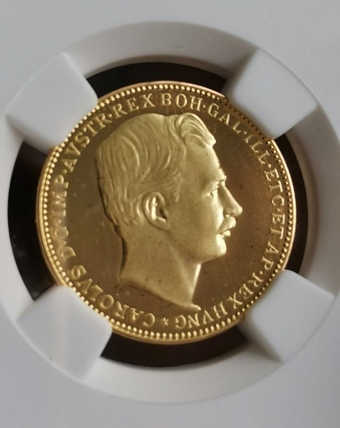 20 KORUNA 1918 Karel I. (1916 - 1918) Dvacetikoruna Karla I. byla poslední zlatou habsburskou mincí v historii a také jedinou mincí s portrétem posledního rakouského císaře. Byla vyražena koncem 1. světové války v nákladu pouhých 2000 kusů.