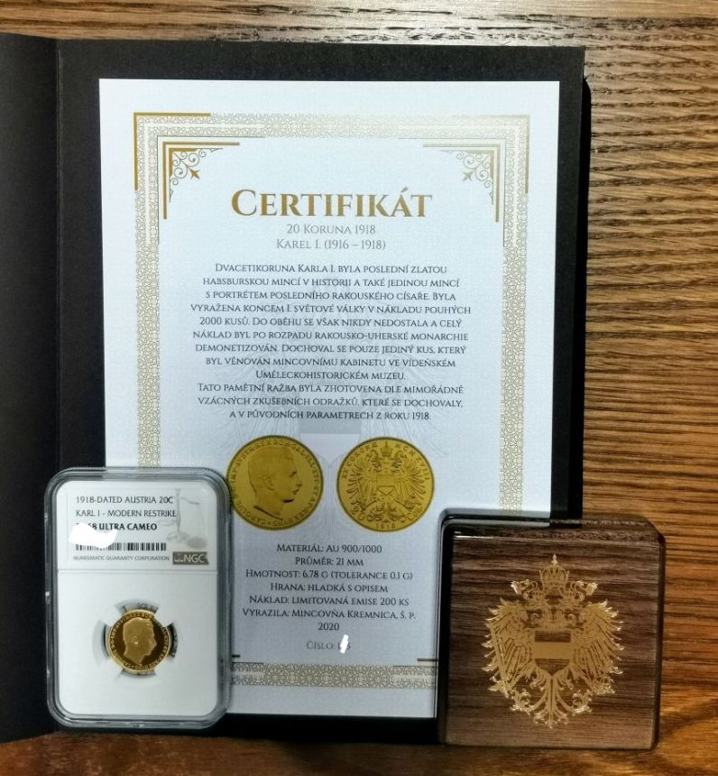 Součástí této jedinečné ražby je krásná dřevěná etue, desky a certifikát pravosti s unikátním číslem odražku.