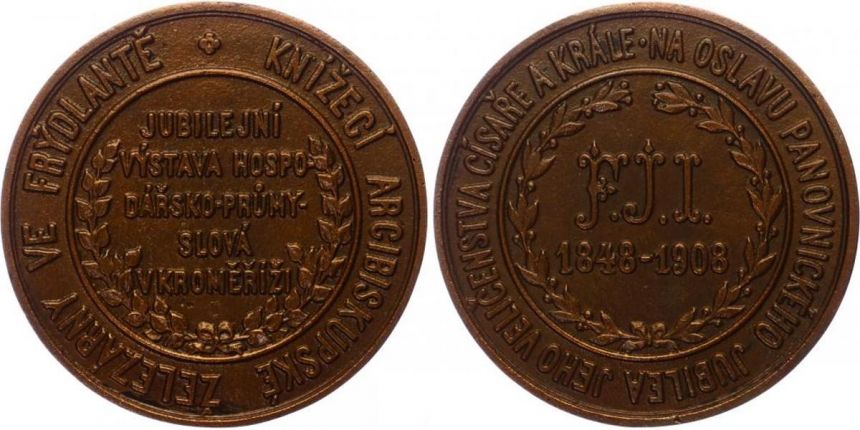 AE Medaile 1908 - K 60. výročí panování a k Jubilejní hospodářsko-průmyslové výstavě v Kroměříži. Monogram, letopočty, opis / 5-řádkový nápis, opis. Výroba Knížecí arcibiskupské železárny ve Frýdlantě, lité patinované Fe 85 mm - velká medaile!! Málo kdy se objeví