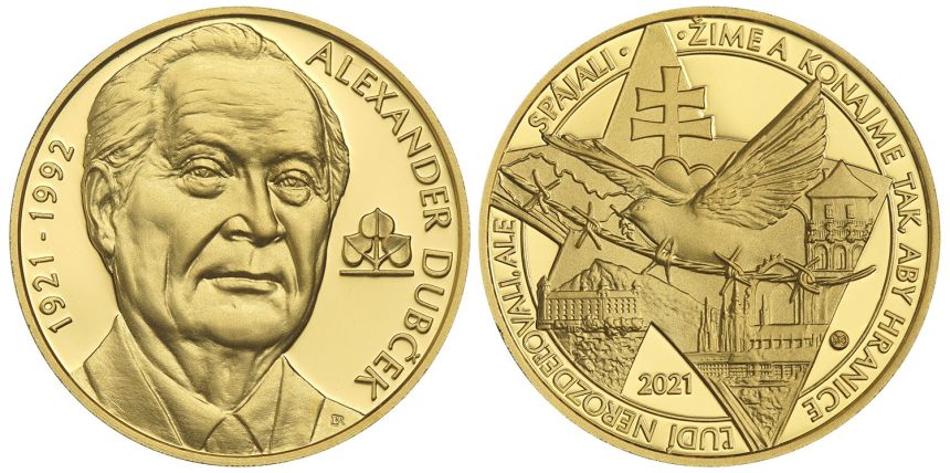Zlatá pamätná medaila pripomínajúca 100. výročie narodenia Alexandra Dubčeka - slovenského politika a štátnika, ktorý sa narodil 27. novembra 1921 v Uhrovci.